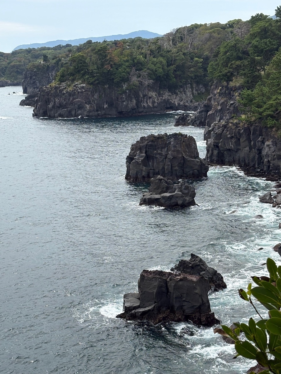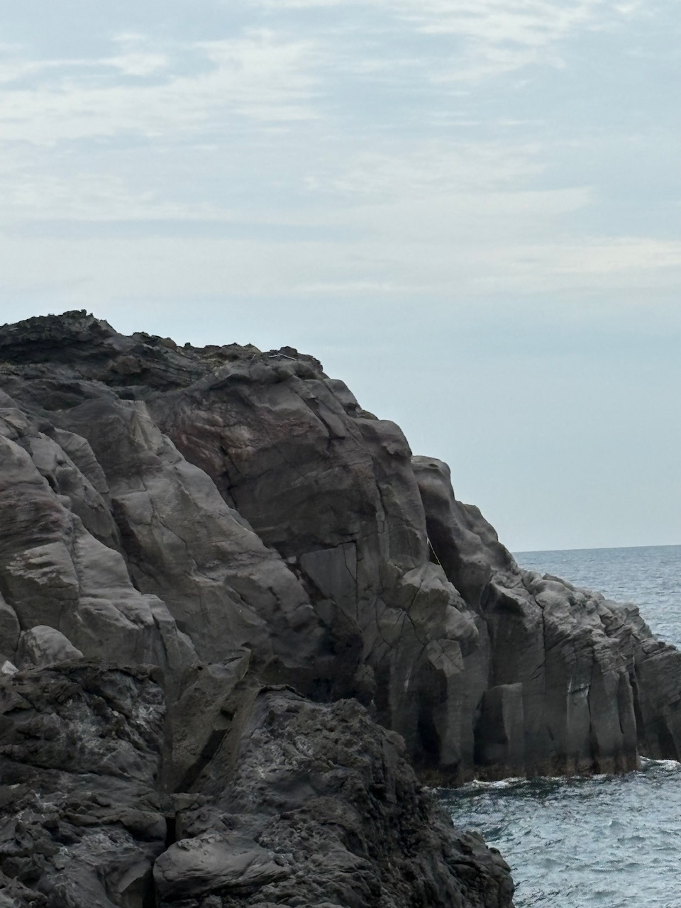 伊豆半島は東伊豆、東伊豆は城ケ崎海岸へ行きました。下記の写真をご覧いただくと岩石の形状、サイズ、色味が珍しく見えませんか。ゴツゴツ感はげしく、サイズは大、色味は黒っぽく、と他県の海岸風景とは何だか違うなぁと感じたのです。調べてみると伊豆半島の生い立ちは、とってもユニーク。元から本州にあった半島ではありませんでした。フィリピン海プレートにあった海底火山が北上を続け、本州に接近・衝突・爆発・隆起して形成されたものです。それ故の形状、サイズ、色味だったと独り合点のいった次第。「だから何?」と突っ込まないように(笑)。